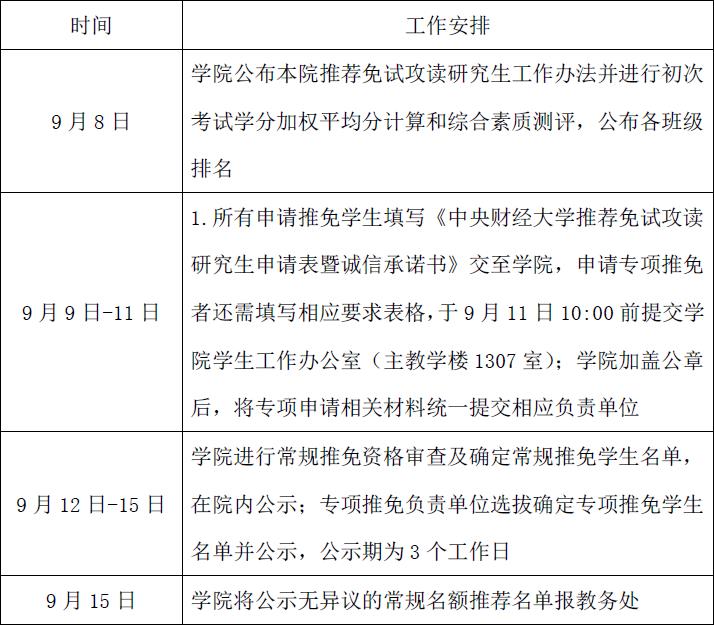 (五)学校推免工作于9月24日前全部结束,学院推免工作为9月15日全部结束。具体时间安排见下: