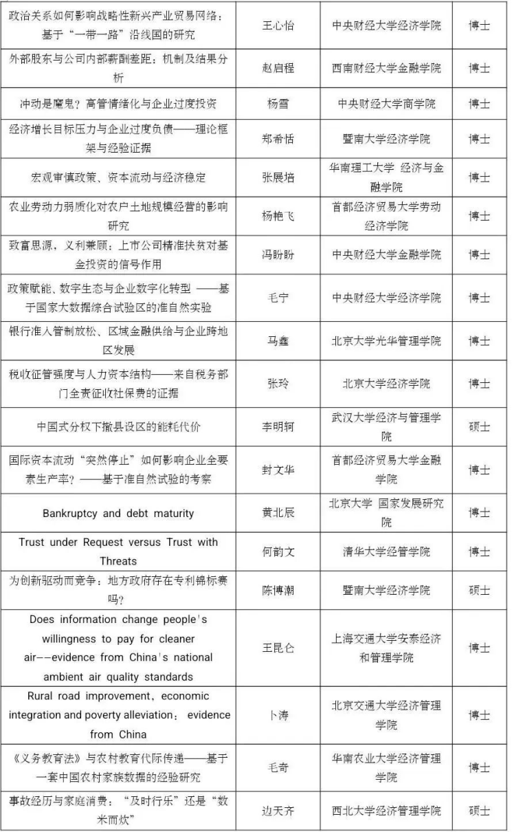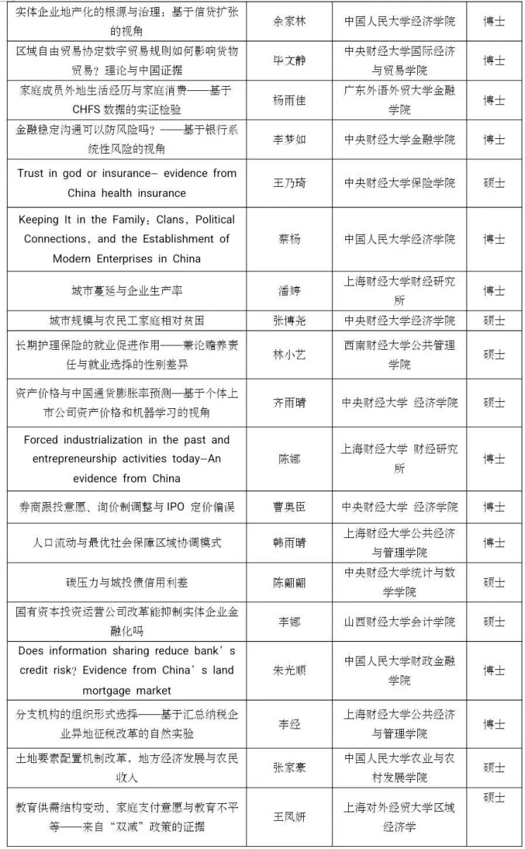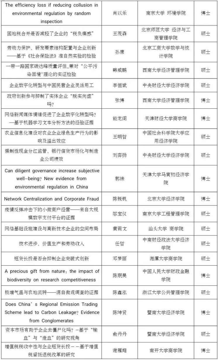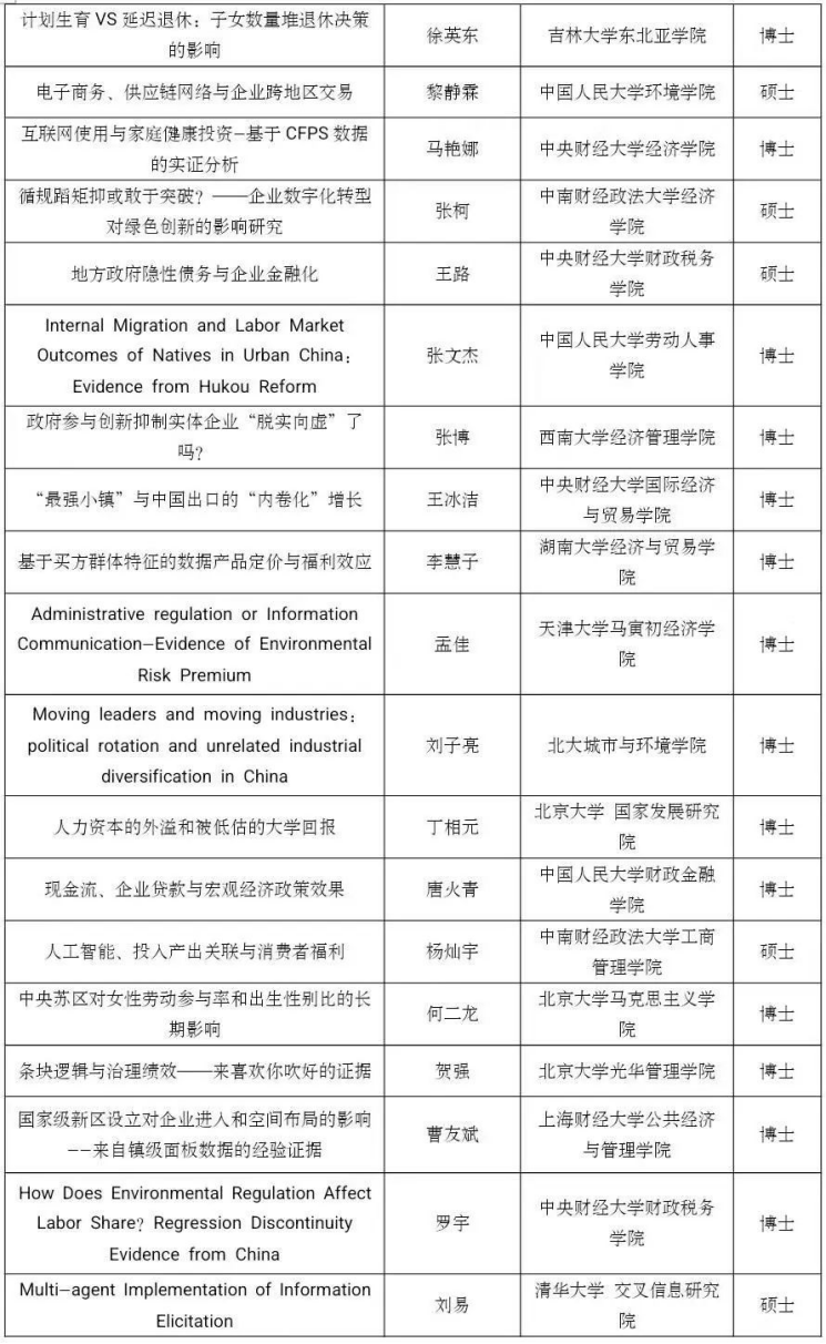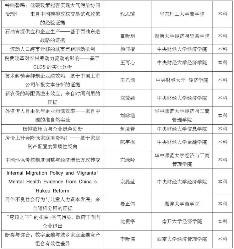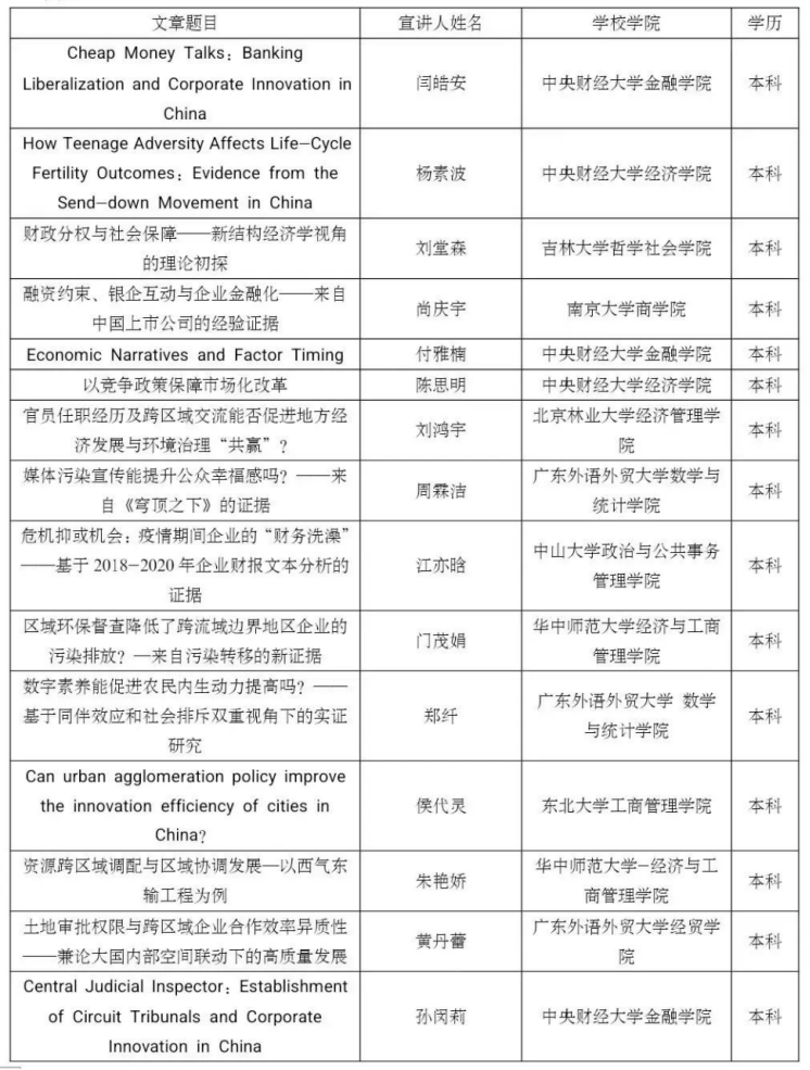 党的二十大报告指出,“教育、科技、人才是全面建设社会主义现代化国家的基础性、战略性支撑”。为了学习、贯彻和落实党的二十大关于教育和人才建设的精神,BEAT365英国官网联合中国经济学年会、中国青年经济学家联谊会主办第五届未来经济学家论坛。本论坛坚持“公平、公正、公开”的原则,鼓励思想争鸣、学术创新,旨在为未来有志于从事经济学研究的全国高校在校学生(本科生和研究生)提供一个观点交流、思想碰撞的学术交流平台。本次论文征集环节共收到612篇投稿论文,经过评审论证和评审,最终遴选出126篇入围会议,名单如下,恭喜各位入选的同学: