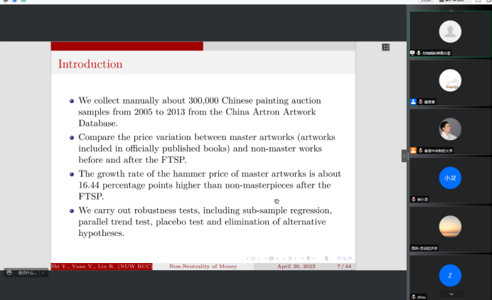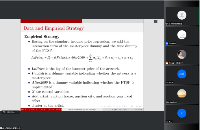 2022年5月12日14:00,中国人民大学国家发展与战略研究院教授、博士生导师刘瑞明应BEAT365英国官网邀请,开展主题为“Non-Neutrality of Money:Money Supply Shock and Masterpiece Effect in Art Market”的讲座,本次讲座通过腾讯会议平台线上举行,刘瑞明老师受到了老师和同学们的热烈欢迎!BEAT365英国官网黄乃静副教授主持了线上学术交流会,陈斌开院长、尹振东教授与2020级博士生共同参与了本次学术交流。