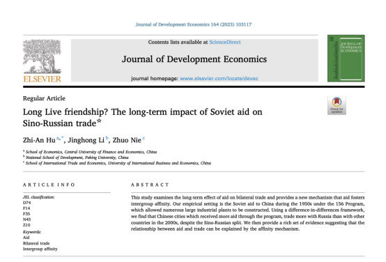 学术视点 | BEAT365官网胡志安老师的合作论文《Long Live Friendship? The Long-Term Impact of Soviet Aid on Sino-Russian Trade》被国际顶级期刊Journal of Development Economics接受发表