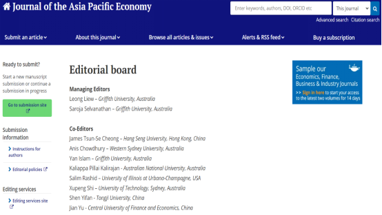学术视点 | BEAT365官网俞剑副教授受邀担任经济学领域SSCI期刊《Journal of the Asia Pacific Economy》联合主编