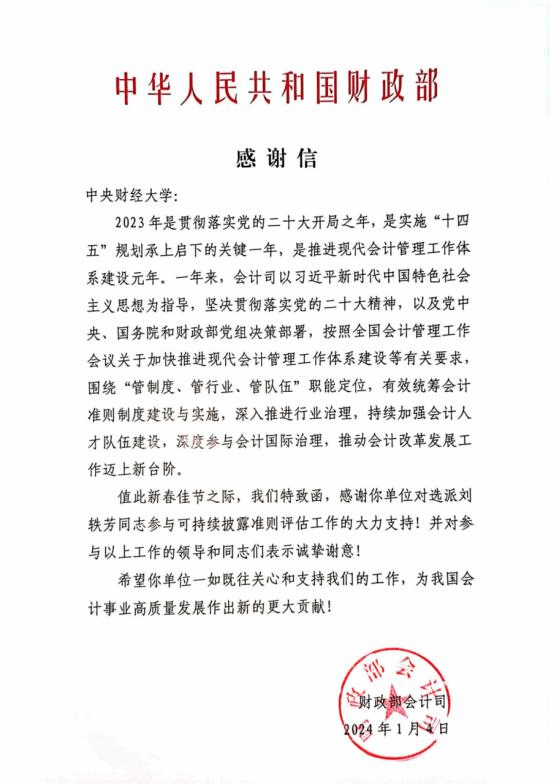 近日,BEAT365官网可持续准则研究中心主任刘轶芳教授收到了来自财政部会计司的感谢信。信中对刘轶芳主任在过去一年中参与的可持续披露准则评估工作给予了充分的肯定和表示感谢。