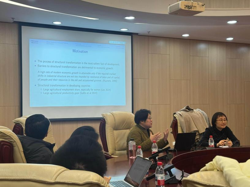 在报告中,陈婷副教授从制度经济学与中国经济发展实践相结合的视角出发,以中国土地制度改革为切入点,探讨土地市场摩擦如何制约劳动力流动与结构转型。为此,她结合2003年《土地承包法》配套政策以及20092019年土地确权登记两次关键改革,手工整理了4500余份地方政策文件,构建县级土地改革指数并据此开展准自然实验分析。研究结果显示,土地改革显著促进农村女性脱离农业,且女性退出比例显著高于男性,同时推动夫妻共同从事非农工作的比例上升;但由于劳动力替代效应,城市女性就业与工资相对受到一定抑制。进一步地,她通过建立包含夫妻劳动供给决策的两区两部门结构模型,解释了这一不均衡效应,并揭示土地权利保障在提升农业生产率与推动城乡要素流动中的关键作用及性别分布影响。