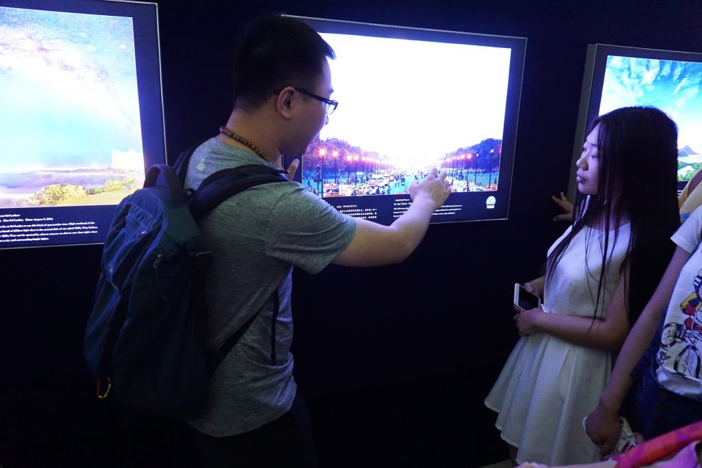 步入展厅,戴老师首先向大家强调了“同一个世界,同一片星空”的策展理念。丝绸之路是连接东西方经济、政治与文化的重要通道。星空则是人类宝贵的自然资源和文化的组成部分。不同文化背景的人,对星空会有着各自的解读,但丝绸之路上所有的人,无论古今,都共享这片星空。接下来,我们从中国嘉峪关上的北斗七星开始,顺着展廊的银河带,沿着陆上丝绸之路和海上丝绸之路,开启了一段奇妙的星空之旅。沿着丝绸之路的旅行,地面的景观在不断发生变换,但头顶的星空却是相同的。星空没有国界,星星平等地闪耀在每个国家之上;星空之下,人类共有一个家园,合作才能共赢共享——对于暗夜星空保护和星空探索如是,对于世界经济发展亦如是。古丝绸之路跨越了东西方文明,将不同文明、宗教、种族联系在一起,基于求同存异、开放包容的精神,创造了共同繁荣。今天,为了应对当前经济增长乏力、发展鸿沟突出、风险日益增加等世界局势,中国提出了“一带一路”的解决之道。