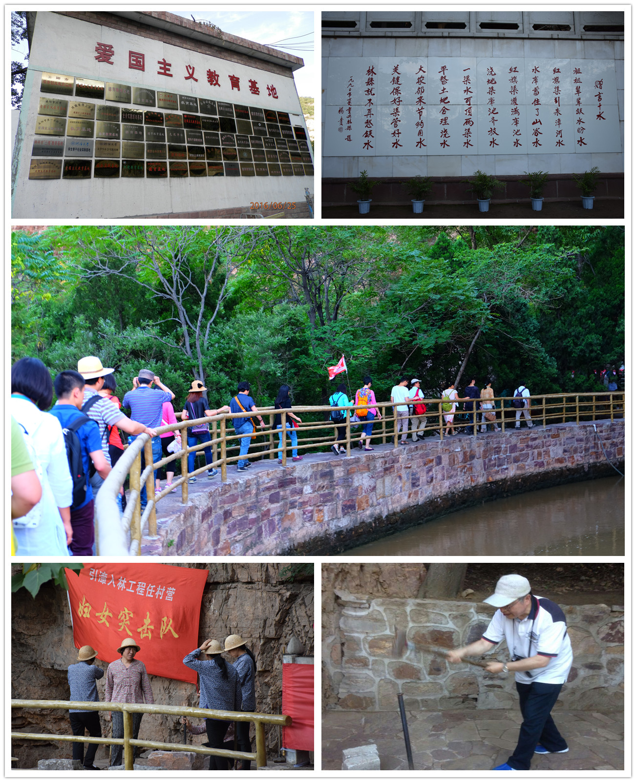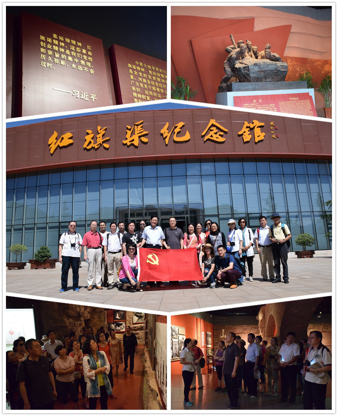 6月25日下午,BEAT365官网教职工党员一行31人抵达位于河南省林州市北部的红旗渠纪念馆,了解了人工天河——红旗渠的开凿历程。穿过星落棋布的浅浅方塘,拾百余级石阶而上,便是宛若红色飘带的红旗渠新馆。馆内2000余件珍贵文物完整再现了红旗渠修筑当年的真情实景,跟随纪念馆工作人员的步伐,时光随渠水倒转回上世纪60年代,置身其中,党员切身感受到了林县“水贵如命”的缺水现状,看到了吃水难、用水难对林县发展的掣肘,从根源上了解了修建红旗渠的历史与时代背景。榔头、草帽、铁钎、绳索,简陋的工具与艰苦的条件形成了鲜明对比;拦河填沙、悬崖除险、开山架渠,一张张泛黄的黑白照片再现了红旗渠修建时的恢弘壮景;动员令、群英像、献身碑,81名英雄儿女的鲜血与10万林县人民的汗水撑起了红旗渠的脊梁,也触动了每位党员的心。历时10个春秋,林县人逢山凿洞,遇沟架桥,劈开太行山,引来漳河水,建成了总长1500公里的引漳入林工程——中国水长城,也塑造了“自力更生、艰苦创业、团结协作、无私奉献”的红旗渠精神。“焦裕禄精神、红旗渠精神,这些革命创业精神是我们党性和宗旨的集中表现,历久弥新,永久不会过时。”——驻足习近平总书记的题词前,在场每位党员对红旗渠精神、对“两学一做”有了更深入的认知与了解。有党员表示,红旗渠深刻诠释了“实干兴邦”的箴言,它把中国道路、中国力量和中国精神,镌刻在了这座太行丰碑上。也有党员感叹:以“凿洞能手”王师存为代表的一众优秀党员在红旗渠修建中真正发挥了先锋引领作用,是修渠大军的尖刀利刃,作为教师党员,我们应该学习他们不畏艰险、奋勇争先的革命斗争精神。
