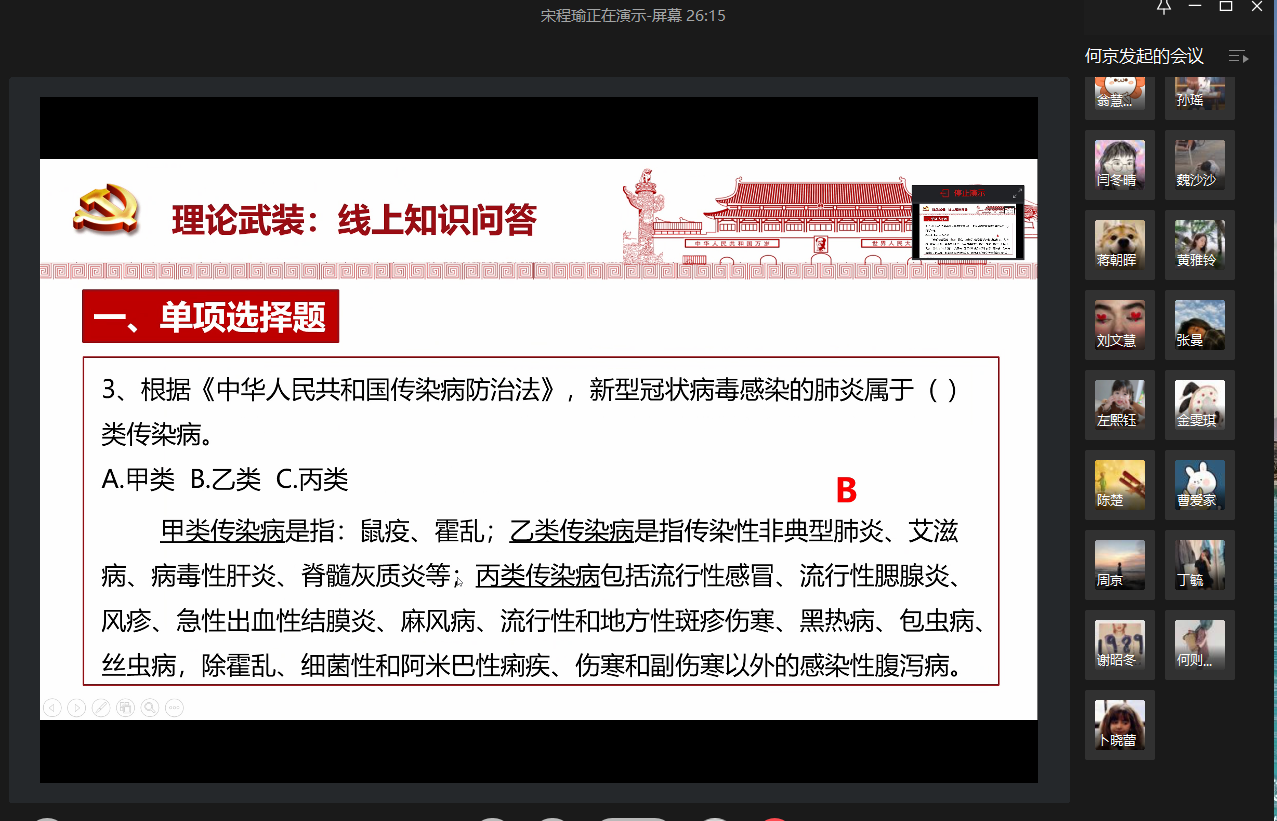 随后是线上知识问答环节,由组织委员宋程瑜主持。在前期的准备工作中,支部党员广泛自学防疫政策,为本次知识问答出谋划策。在答题的过程中,党员们认真竞答、踊跃参与、积极互动。