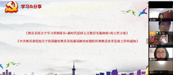 随后,大家就近期学习情况进行了交流和讨论,党员们分别表达了自己对疫情的想法以及对未来的展望。吴凯带领大家系统学习了《教育系统关于学系贯彻落实<新时代爱国主义教育实施纲要>的工作方案》和《中共教育部党组关于统筹做好教育系统新冠肺炎疫情防控和教育改革发展工作的通知》,阅读了“习近平总书记给北京大学援鄂医疗队全体90后党员的回信”。大家纷纷表示:疫情面前,更加深刻地认识到中国抗疫彰显的中国共产党领导和社会主义制度的显著优势。总书记的回信更是极大的激励了“90后”的党员们,当代青年更要将个人理想与国家发展紧密相联,做最坚定的爱国主义精神弘扬者和践行者,让青春在党和人民最需要的地方绽放绚丽之花!