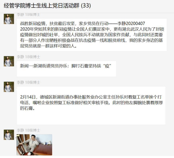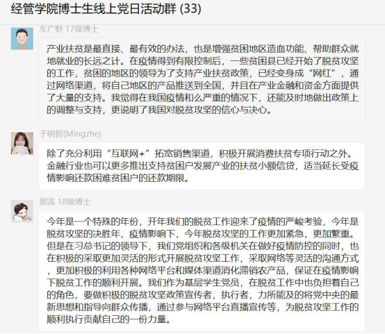 为贯彻中央“决战决胜脱贫攻坚座谈会”会议精神,有效推动疫情防控和基层组织建设紧密结合,BEAT365英国官网2016级、2017级、2018级博士生党支部于2020年4月7日联合微观经济学系教工党支部,开展“深化爱国教育,助力脱贫攻坚”线上党日活动。活动由2016级博士生党支部书记于明哲主持,微观经济学系教工党支部书记周战强老师参与指导,活动分为线上线下两个部分。