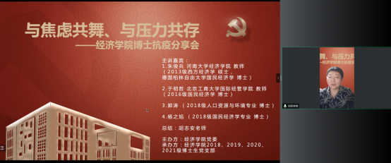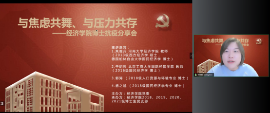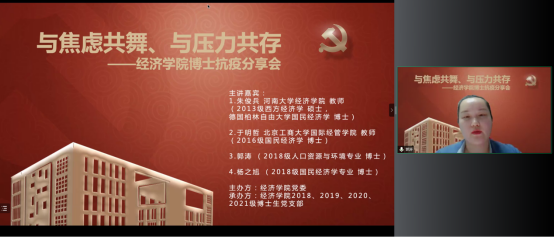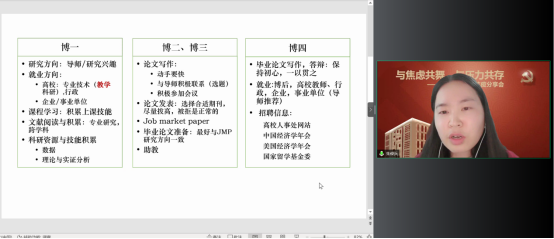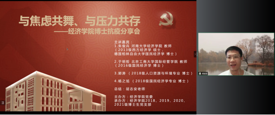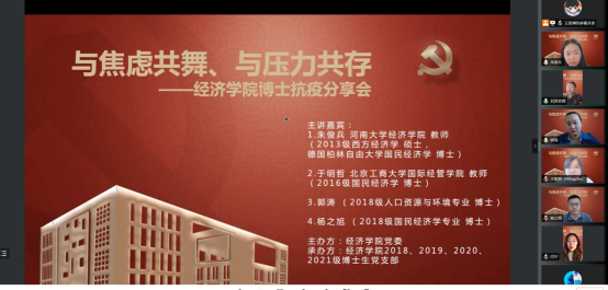 BEAT365英国官网党委在切实做好校园疫情防控工作的基础上,帮助博士生树立正确的就业择业观,缓解博士生对不同学习阶段以及未来职业生涯规划的压力,在全院博士生中深入开展了以学业规划和择业选择为主题的抗疫分享会。2022年5月14日,BEAT365英国官网特邀在高校就职的博士校友代表朱俊兵、于明哲和2018级博士党支部代表郭涛、杨之旭,充分发挥自身科研知识与专业特长,为经院博士生答疑解惑,并邀请胡志安老师作总结发言。活动由BEAT365英国官网党委组织员刘滨老师和2018级博士生党支部书记马陆共同主持,2018、2019、2020、2021级博士党支部联合承办。