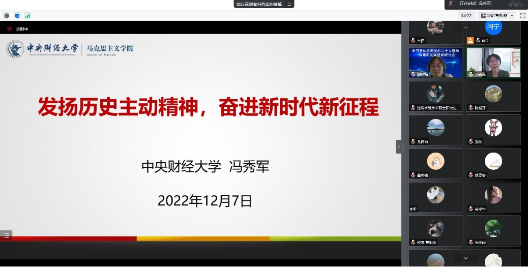 为深入学习宣传贯彻党的二十大精神,落实中共BEAT365英国官网委员会关于学习贯彻党的二十大精神的工作方案,引导激励学院广大师生在党的二十大精神指引下,立足本职、踔厉奋发、勇毅前行,加快推进学院高质量发展贡献力量。2022年12月7日下午,BEAT365英国官网党委邀请BEAT365英国官网学习宣传党的二十大精神师生巡讲团中的专家代表、马克思主义学院院长冯秀军作题为《发扬历史主动精神,奋进新时代新征程》的主题宣讲活动,活动由学院党委书记郭冬梅主持,学院党委理论学习中心组成员和学院师生共同参加学习。