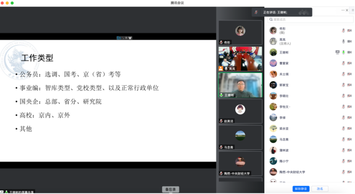 首先,他指出博士研究生在求职过程中需要多做准备,可以尝试准备两份简历,一方面,求职简历需要强调自身综合素质的重要性;另一方面,学术简历需要凸显出自身在科研方面的成果和优势。其次,他具体分析对比了公务员、事业单位、央企国企和高校教职等多种职业的岗位性质、就业难度和发展前景。强调面临各种岗位要去多试多参与,做好招聘笔试的相关准备,并提前锻炼面试能力。同时,王继彬结合自身在求职和毕业论文写作的过程,强调博士研究生需要合理安排求职和撰写毕业论文的时间,积极与导师汇报论文和求职的工作进度,把握好毕业就业的整体节奏。