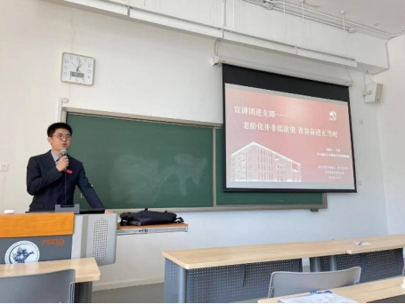 王赛讲师首先梳理介绍了古代老龄化问题的发展以及古人退休的政治待遇和经济待遇。随后介绍了我国人口老龄化现状。他讲道当一个国家进入老龄化不仅会增加社会养老、医疗等方面的压力,还可能会催生一批新一代低欲望年轻人,并产生一系列社会问题。接着,他列举当代榜样青年的事例,以戍边英雄的事例告诉大家:“神仙湾哨所不会有“神仙”,但却有一群朝气蓬勃,积极勇敢的青年人。”最后,他从“我能够做什么”、“我应当做什么”和“我应当成为什么样的人”三个方面对参会党员提出建议。