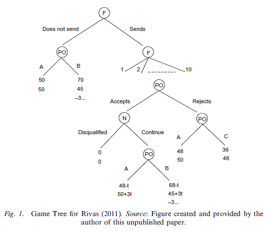 但是,官员仍可以选择拒绝受贿。一旦拒绝,官员可以选择行动A:即采取中立行动(neutral action?),这样,官员和公司均得到拖欠回报(default payments?);或者官员可以选择惩罚公司。这种情况下,官员的报酬不变,但公司损失很大。作者比较关心官员接受腐败且采取互惠行动B的可能性有多大。图1为这个博弈的博弈树。