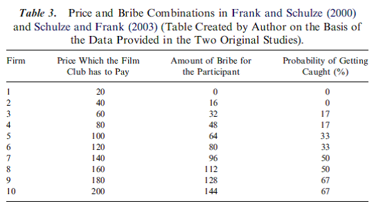 表三的第二列是取回纸钞的价钱,第三列是给决策者的贿赂。表三的第一行,取回纸钞所支付的报酬为20马克,而贿赂金额为0,这种情况对电影俱乐部最有利。表三最后一行,取回纸钞需支付200马克,贿赂金额为144马克,这对决策者最有利,可电影俱乐部拿不到任何钱。在这个研究中腐败行为没有被抓的风险。