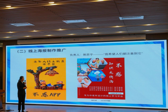 在团队展示环节,各个队伍大展才华、侃侃而谈,精炼地介绍了各自项目的设计背景、策划方案和营销成果。“中老年用户线上学习APP”、“外卖无接触配送”、“个性健康养老”、“高校学生交互”、“线上教育”、“智慧养老”、“宅经济”、“云旅行”,每一个项目都对“后疫情时代”的主题进行了深入探索,有很强的现实意义。各队伍分工合作,既结合翔实数据和社会实情充分分析了项目的可行性,又图文并茂地介绍了项目取得的成果,淋漓尽致地表现出了参赛同学们深厚的经济学学识和卓越的市场调查、策划营销能力,秀出了青年领袖的风采。