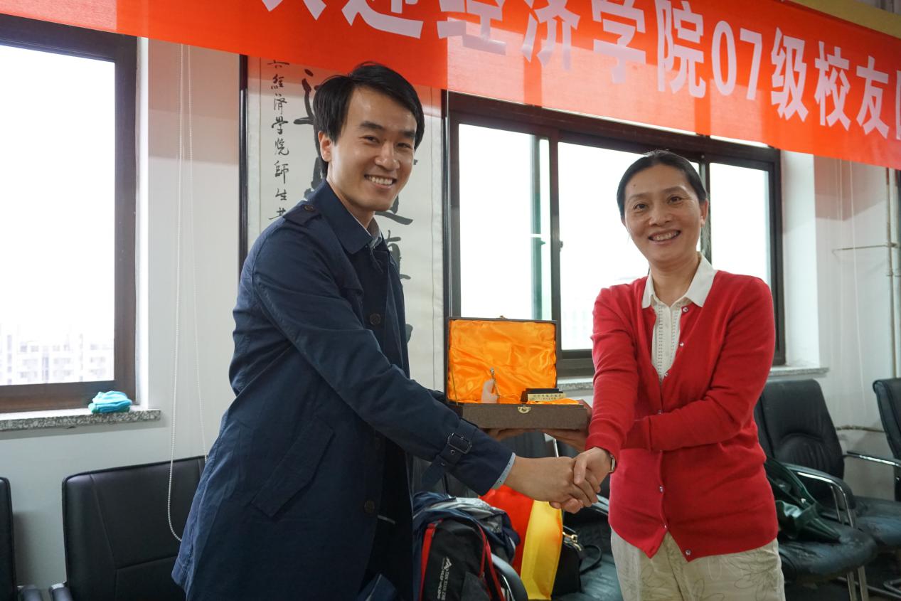 继老师们讲话之后,大家共同欣赏了老照片做成的纪念视频,看着曾经熟悉的面孔、彼此打闹的瞬间、搞笑的生活囧图和班级出游的合照,往事如电影般于眼前展现,忆起曾经的青春朝气、深情厚谊,校友们一边笑着一边红了眼眶。各位校友纷纷发言,激动之情溢于言表。经济学班班长姜海和国民经济管理班班长陶鹏代表学院2007级的45名本科同学向母校的辛勤培养和恩师的循循善诱、不吝赐教表达衷心的感谢。校友们表示,这次源于毕业时的五年之约的返校之行,同学们从祖国各地奔赴母校共聚一堂,恩师们于国庆佳节热情招待,让他们非常感动和骄傲。期待未来的十年聚,二十年聚,能将师生感情、校友情怀不断延续下去。因故未能到场的校友还纷纷录制了视频借以表达对同学、老师和母校的思念、感恩和祝福。陶鹏校友代表2007级全体本科校友向学院赠送礼物,以帆船寓意学院一帆风顺、蓬勃发展,祝愿学院越办越好。