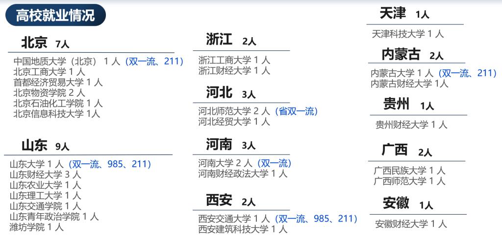 近五年来,学院高度注重博士生学术研究的就业引导,从数据看:33位博士毕业生选择国内知名高校任职(其中6人入职国内“双一流”大学),17位博士毕业生选择国内外知名高校的博士后岗位继续学术研究,15位博士毕业生入职国家发改委宏观经济研究院、国家信息中心等研究类事业单位,8位进入国家和地方机关单位工作,15位进入金融或国企的经济研究相关部门。除非定向之外,17位博士毕业生高校定向就业,11位博士毕业生在国家部委和大型金融企业定向就业。学院在博士生培养及学术就业方面取得了突破性进展。