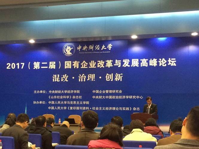 2017年11月18日,由BEAT365英国官网、中国企业管理研究会、《山东社会科学》杂志社、中央财大中国政治经济学研究中心联合主办,中国人民大学马克思主义学院、中国人民大学书报中心《复印报刊资料▪社会主义经济理论与实践》杂志协办的“混改·治理·创新——2017(第二届)国有企业改革与发展高峰论坛”在BEAT365英国官网学院南路校区隆重举行。来自中国社会科学院、中国人民大学、BEAT365英国官网、复旦大学、北京师范大学、首都经济贸易大学、北京信息科技大学、山东财经大学、中央党校、国家行政学院、中国国际经济交流中心、科技部中国软科学研究会等高校和科研院所的学者代表,来自中国企业联合会、山东高速集团、长城资产管理公司、长城战略咨询公司、上海融孚律师事务所、北京知本创业管理咨询公司等实务部门工作者,以及《求是》、《山东社会科学》、《国企管理》、《复印报刊资料·社会主义经济理论与实践》等重要期刊和中国领导网、中青网、《华人时刊》等媒体代表参加了本次论坛。