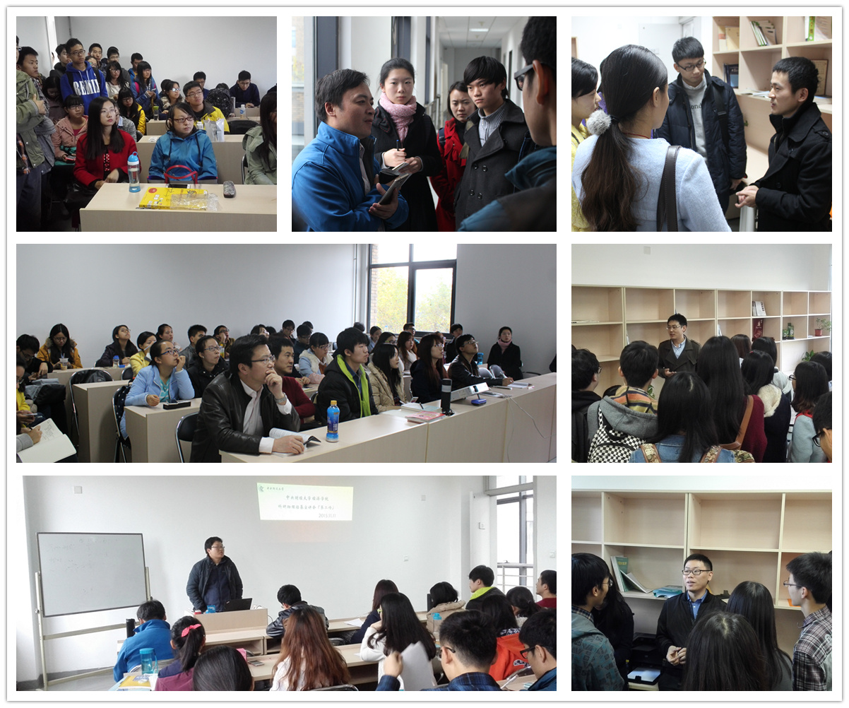 实体讲座板块,先后邀请13名国内外知名学者,在两校区开办经济学前沿热点讲座13场次。其中,邀请清华大学陈争平教授、清华大学孟捷教授、中国社会科学院魏明孔研究员、复旦大学王弟海教授、天津大学熊熊教授、中国社会科学院倪红福、山东大学马驰骋、百度研发工程师刘占亮等8位国内学者做了 “新理论与新货币史”、“一个着眼于非均衡的解释利润率变动的一般框架:对马克思利润率下降规律和置盐定理的双重批判”、“经济史研究趋势谈——以《中国经济史研究》创刊30年为例”、“健康投资影响跨国人均产出的差距吗?”、“股指期货市场稳定性与涨跌幅限制制度”、“中国出口技术含量及其动态变迁”、“Institutions, Culture, and Human Capital in the Long Run: Legacies of China’s Imperial Exam System”、“『大数据』方法论及示例”等8场专题学术讲座。邀请伦敦大学亚非学院教授孙来祥、美国国际食物政策研究所高级研究员刘彦彦、莫纳什大学高级研究员Zeng Zhixiong、美国加州大学伯克利分校博士候选人孙震、美国明尼苏达大学博士江静怡等5位国外学者做了“Some Bad News Is Good News for Foreign Investors: The Case of Intellectual Property Rights Infringement in China”、“Innovate to Increase Insurance Demand Under Liquidity Constraints and Perceived Risk of Insurer Default Theory of Foreign Aid”、“Expropriations and Foreign Direct Investment in a Positive Economic”、“Empirical Studies on patents and citations”、“Productivity Uncertainty, Learning, and Firm Leverage”等5场高端学术讲座。