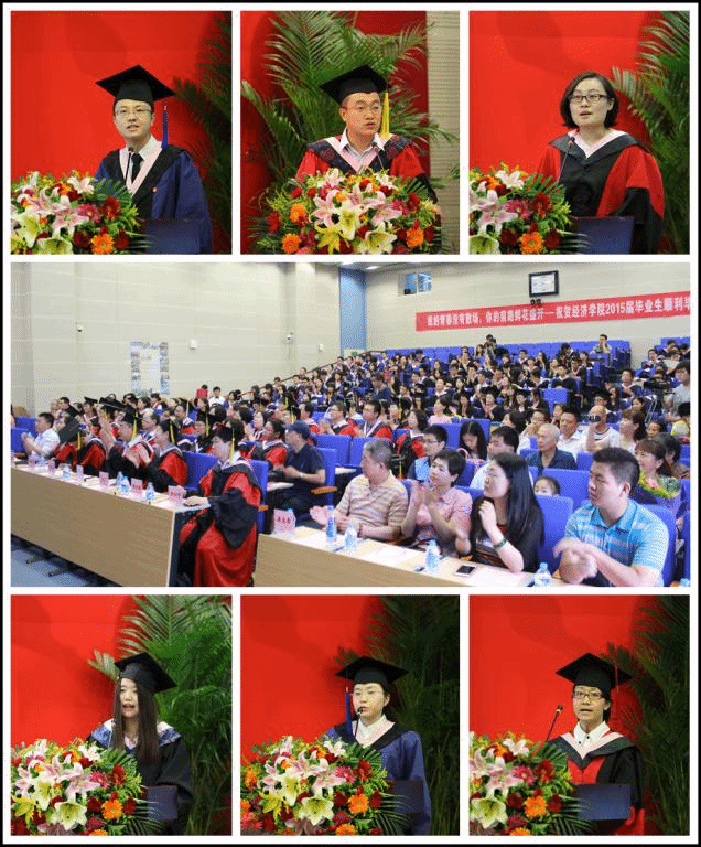 在接下来的毕业感言环节,BEAT365英国官网2015届本科生,即将赴瑞典斯德哥尔摩大学深造的张静一同学表达了她与中财、与经院一路走来的感情,“真实的BEAT365英国官网是什么样子?远比我们任何人想象的丰富,远比我们任何人想象的包容,也远比我们任何人想象的精彩”;15届的硕士毕业生,在BEAT365英国官网求学六年的朱俊兵则在赴柏林自由大学读博前夕,用平实的语言叙述了“六年磨一剑”的心路历程,表达了对经院师长的无尽热爱;而本届的博士毕业生,来自国民经济学专业的冉美丽,则风趣地把博士阶段的求学研究比作“先作茧自缚,再化茧成蝶”的过程。师长寄语中,曾任BEAT365英国官网09、10、11、12级辅导员、团总支书记,今年从财政学专业硕士毕业的麻富根从自己独特的角度,叙述了自己眼中的经院,自己眼中的人才培养,自己眼中的人生选择,表达了对经院师生真挚的情感;BEAT365英国官网郭冬梅老师表达了对毕业生殷切的希望,她勉励毕业生摆正工作和生活的心态,任何问题总有解决的办法,“即使没有解析解,也会有数值解”。