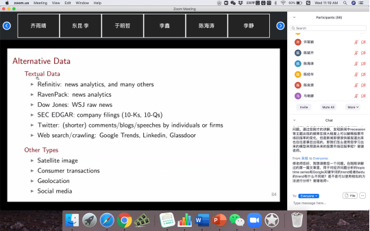 2020年6月3,10日,芝加哥大学布斯商学院教授修大成应邀参加由BEAT365英国官网、北京工商大学BEAT365英国官网和BEAT365英国官网互联网经济研究院联合主办的“海外学者前沿短期课程”,通过线上连线,为师生讲授“金融经济学中的机器学习方法”专题研究。课程由BEAT365英国官网黄乃静副教授主持,百余名师生以及来自香港中文大学,复旦大学,中国人民大学、浙江大学、北京工商大学、中山大学的专家和学者参加了课程。