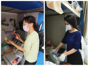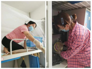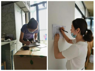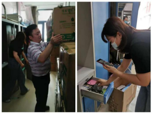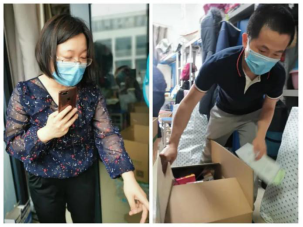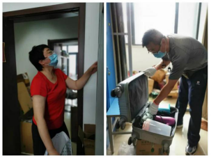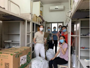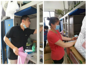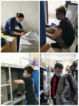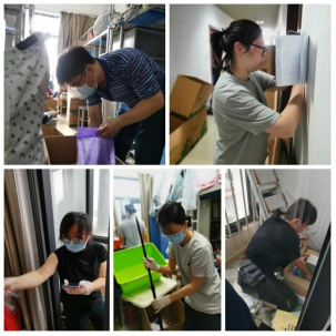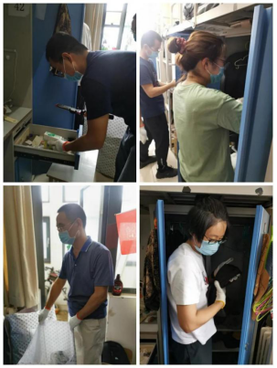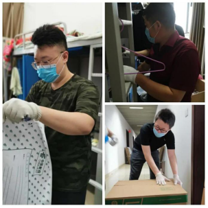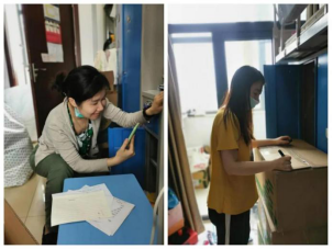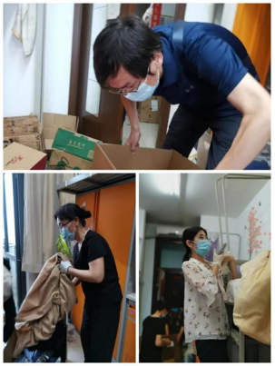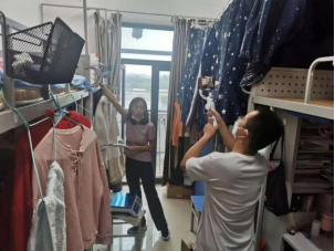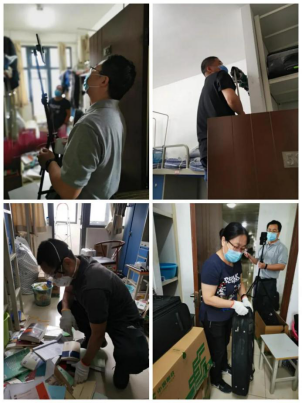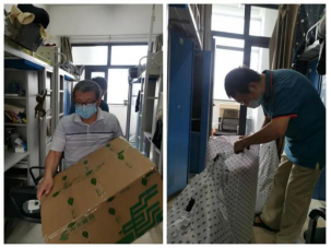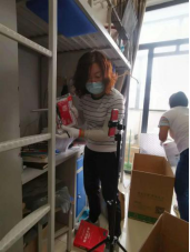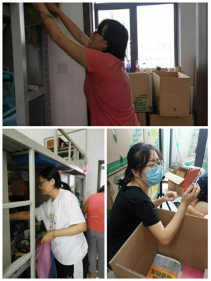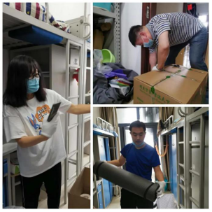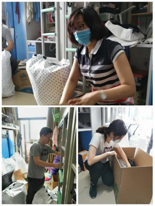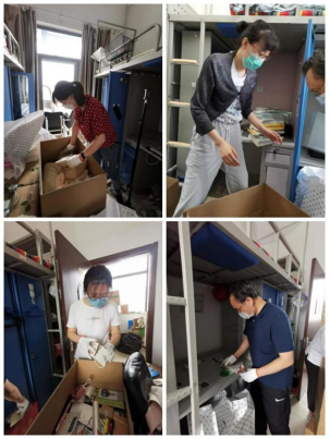 来到宿舍楼,老师们分为27个工作组进入学生宿舍,按照培训的步骤,迅速地熟悉了环境,正式“开工”。让我们一起看看,在打包现场的那些熟悉的面孔。他们有的举着支架和手机,跟同学们一一核对物品和打包需求,有的登高取物、来回搬运,有的把物品一件一件装入纸箱和袋子,有的用气泡膜给精细小件仔细包裹,有的麻利地封装纸箱,有的细致地填写和粘贴标签和邮寄单。老师和学生一起线上共同经历这个特别而难忘的时刻,氛围很是热烈,老师们投入的样子,可爱可敬。