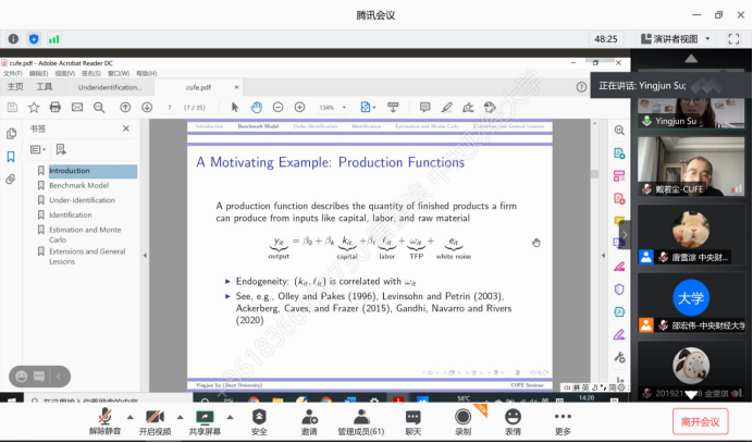 2020年11月4日,暨南大学经济与社会研究院教授苏应俊应BEAT365英国官网邀请,使用腾讯会议在线上开展了主题为“基于时间和信息集假设的结构模型识别不足”的讲座,本次讲座于下午14点开始,持续两个小时。讲座由BEAT365英国官网戴若尘老师主持,BEAT365英国官网部分师生及校外同学参加了此次讲座。
