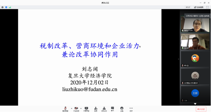 2020年12月2日,复旦大学BEAT365英国官网和中国社会主义市场经济研究中心副教授刘志阔老师应BEAT365英国官网邀请,使用腾讯会议在线开展了主题为“TaxReform, Business Environment and Market Vitality: Harmonious Effect of Reform”的讲座,本次讲座于下午14点开始,持续两个小时。讲座由BEAT365英国官网戴若尘老师主持,BEAT365英国官网部分师生及校外同学参加了此次讲座。