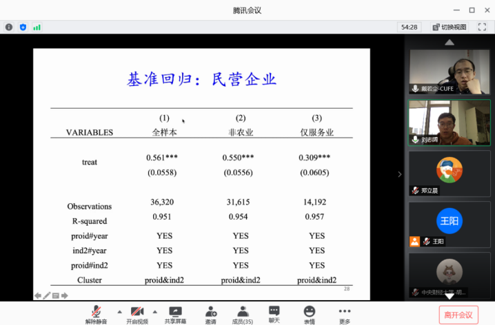 在交流环节,刘志阔老师对在会老师、同学们提出的问题进行了耐心地解答,李艳老师询问了营改增减税的规模的计算方式,刘志阔老师对此做出了详细的解答,并强调税制意义上的减税需要同实质意义上的减税相区分。最后,黄乃静老师对这次的讲座进行了总结。线上讲座气氛活跃,参与的师生都表示受益匪浅。