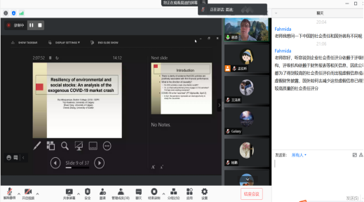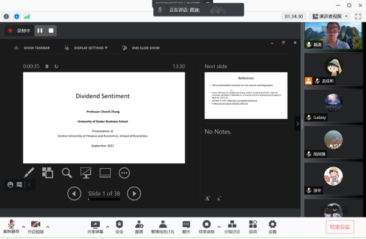 2021年9月16日和21日,英国埃克塞特(Exeter)大学可持续金融中心主任张晨迪教授应BEAT365英国官网邀请,使用腾讯会议APP讲授行为金融专题研究短期课程。20多位师生参加了此次课程。