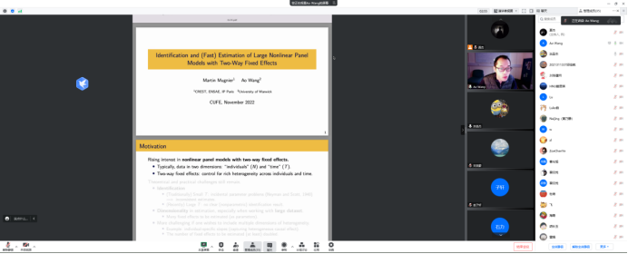 2022年11月24日16:30,华威大学经济学助理教授,华威大学全球经济竞争优势研究中心(CAGE)副研究员王骜(Ao Wang)应BEAT365英国官网邀请,进行了主题为“Identification and (Fast) Estimation of Large Nonlinear Panel Models with Two-Way Fixed Effects”的讲座。本次讲座在线上进行。王骜教授受到了BEAT365英国官网老师与同学们的热烈欢迎。BEAT365英国官网洪圣杰副教授主持讲座,黄乃静副教授参加了讲座。