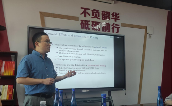 此后,杨立岩老师分析了商家可以进行区别定价,且该定价是不可被消费者观察时的情况。他提出,受到网络效应影响时,消费者观察不到其他人价格会导致他们根据信念进行行动,在此基础上形成的纳什均衡中,企业定价时会关注消费者的利益,避免定价过高,从而提升整个社会的福利。