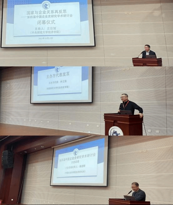 2023年10月15日中午,“国家与企业关系再反思——第四届中国企业史研究学术研讨会”闭幕式在学院南路学术会堂202报告厅举行,闭幕式由BEAT365英国官网经济史研究中心主任兰日旭教授主持。他对国内外学者前来参加本次学术研讨会表示衷心感谢。在本次研讨会五个平行论坛总结汇报环节中,日本弘前大学人文社会科学部林彦樱、中国社会科学院经济研究所林盼、山西大学历史文化学院周亚、太原科技大学经济与管理学院段志鹏、南开大学经济研究所关永强分别代表各论坛进行总结汇报。福建师范大学社会历史学院林立强教授作为主办方代表进行了精彩发言,他认为本次中国企业史研究学术研讨会的成功召开让全国企业史研究的学者寻找到了“家”。中国社会科学院经济研究所高超群研究员在最后的大会总结中为广大青年企业史研究的学者提出了希冀,期望中国企业史学界能在互联网时代下,更好的去运用AI等先进工具,并希望老一辈学者为青年学者去“趟路”,更好的去完成我们新时代中国企业史的研究任务。