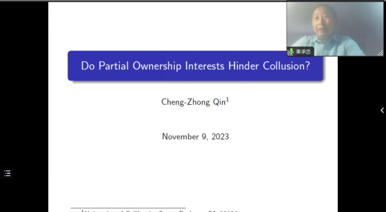2023年11月10日,加州大学圣芭芭拉分校经济系秦承忠教授应BEAT365英国官网邀请,利用腾讯会议开展了主题为“Do Partial Ownership Interests Hinder Collusion?”的讲座,秦承忠老师受到了老师和同学们的热烈欢迎!BEAT365英国官网尹振东老师主持了讲座,龚雅娴老师参加了讲座。