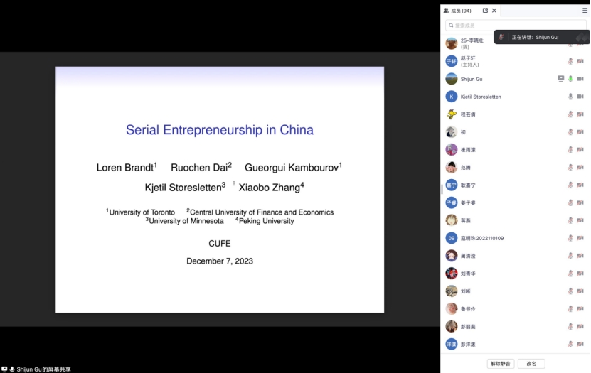 随后,Kjetil Storesletten教授分别从模型构建、分阶段局部均衡、实证检验角度详细介绍了本研究。在两阶段模型的第一阶段,企业进入市场,其全要素生产率随机;第二阶段,企业全要素生产率与第一阶段相关,并依据经营情况决定是否创立新企业和关停旧企业。对理论模型进行细致的推演,分析两阶段、多种全要素生产率水平下企业的连续创业决策。基于理论分析提出假说,股本越大、负债-股本比率随全要素生产率的增长幅度越小;资产净值更高的中小企业更可能创立新企业。在此基础上,本研究整理中国企业工商登记数据、进出口商品检验数据对理论假说进行验证。本研究是连续创业领域文献的重要补充,得出了一系列重要结论:平均而言,连续创业者比非连续创业者更有生产力,这与持续能力是连续创业的主要驱动力这一观点一致。异质性分析方面,连续创业者的生产率溢价完全是由在相同或相关行业成立公司的创业者驱动的。与非连续创业企业相比,连续创业但进入新行业领域的企业尽管资产规模更大,但生产率却明显较低。优先获得外部融资有助于调和这些差异。