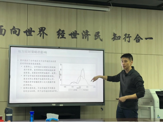 讲座伊始,林建浩老师介绍了选题背景,他以贵州地区在明清时期的“改土归流”变革为例,探讨改革启动先后、改革投入强度和改革中的央地关系对于改革长期效应的影响。