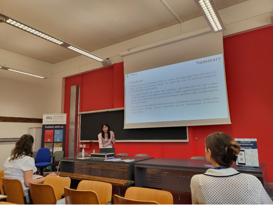 蒋燕在“Governance & Place Leadership for Cities &Regions”分会场中汇报了题为“InnovationSpatial Structure and Industrial Integration in Urban Agglomerations——Analysis Based on Science and Technology Innovation Hub Cities”的学术论文,该论文由戴宏伟老师指导。她的研究成果得到了与会学者的认可,并获得了宝贵的修改和完善建议。