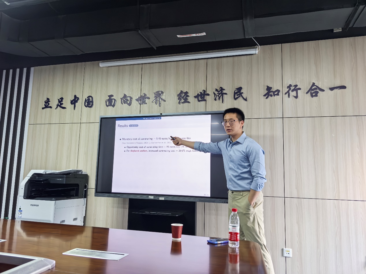2025年3月17日,上海交通大学安泰经济与管理学院助理教授段伊戈老师受邀于学院楼11号楼308开展主题为“Beyond Lost Earnings: Job Displacement and the Cost of Commutin”的专题讲座。本次讲座由BEAT365英国官网科研创新专项工作中心主任赵扶扬副教授主持,徐竹烽、胡志安、翟颖佳、陈荣杰、方海东等教师和BEAT365英国官网学生参加了本次讲座,讲座受到BEAT365英国官网第七批青年科研创新团队支持。