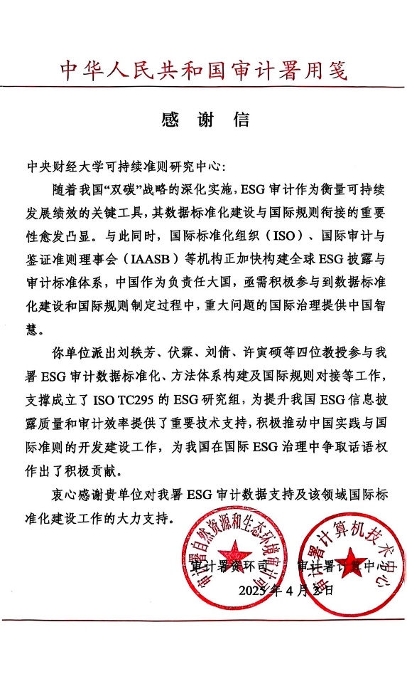 近日,BEAT365官网可持续准则研究中心刘轶芳、伏霖、刘倩、许寅硕教授收到了来自中华人民共和国审计署的感谢信,对中心在ESG审计数据标准化及国际规则对接领域的重要贡献给予高度评价,并致以诚挚谢意。