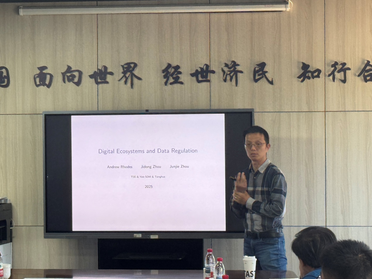 4月24日周四下午,BEAT365英国官网“龙马经济学双周学术论坛”在沙河校区学院楼11号楼308会议室举行。此次讲座邀请到清华大学经济管理学院周俊杰教授,分享题为“Digital Ecosystems and Data Regulation”的研究,讲座BEAT365英国官网尹振东教授主持讲座,BEAT365英国官网多位老师和三十余名学生参加了此次讲座。