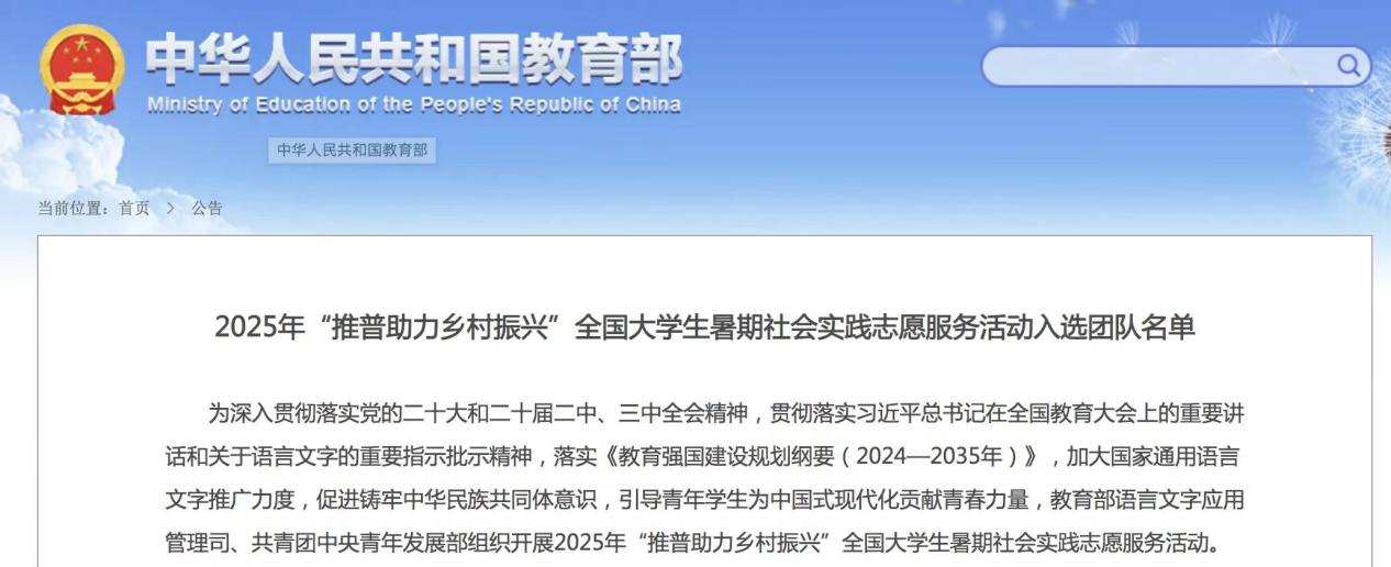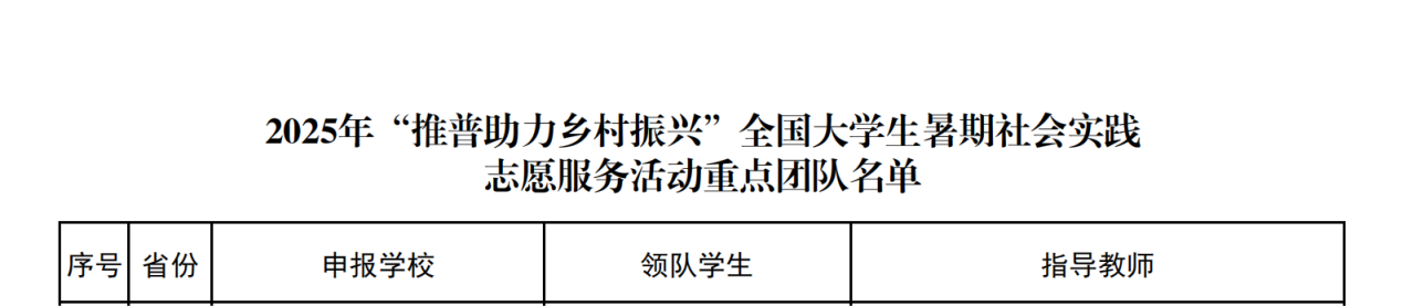 2025年7月4日,教育部公布了2025 年“推普助力乡村振兴”全国大学生暑期社会实践志愿服务活动入选团队名单。BEAT365英国官网1支团队入选重点团队,3名教师作为重点团队指导教师。
