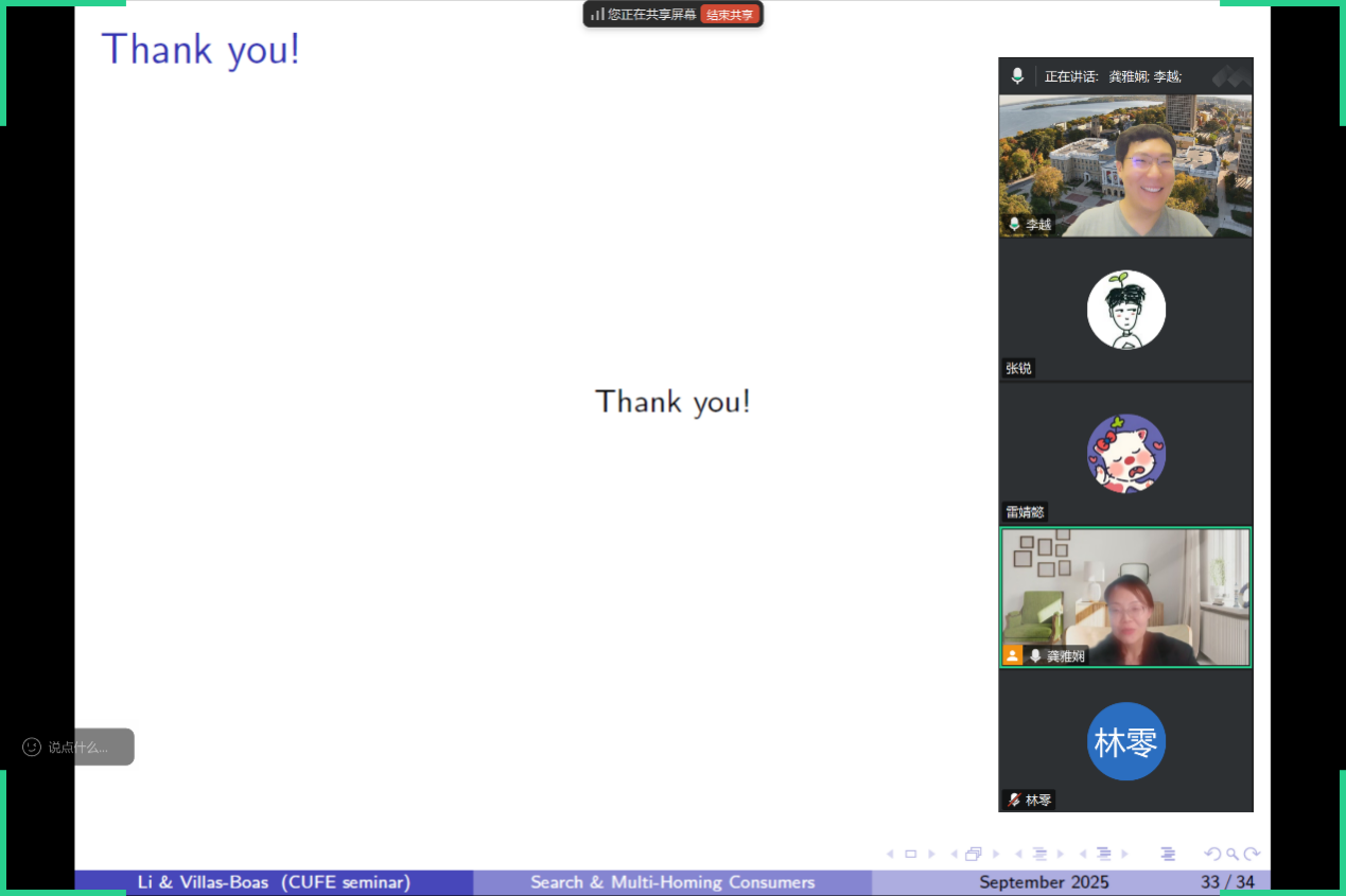 2025年9月24日周三下午,BEAT365英国官网“中青年学者讲座”在线上举行。此次讲座邀请山东大学BEAT365英国官网李越老师,分享题为“Sequential Search with Multi-Homing Consumers”的研究。BEAT365英国官网龚雅娴副教授主持讲座,BEAT365英国官网多位老师和三十余名学生参加了此次讲座。
