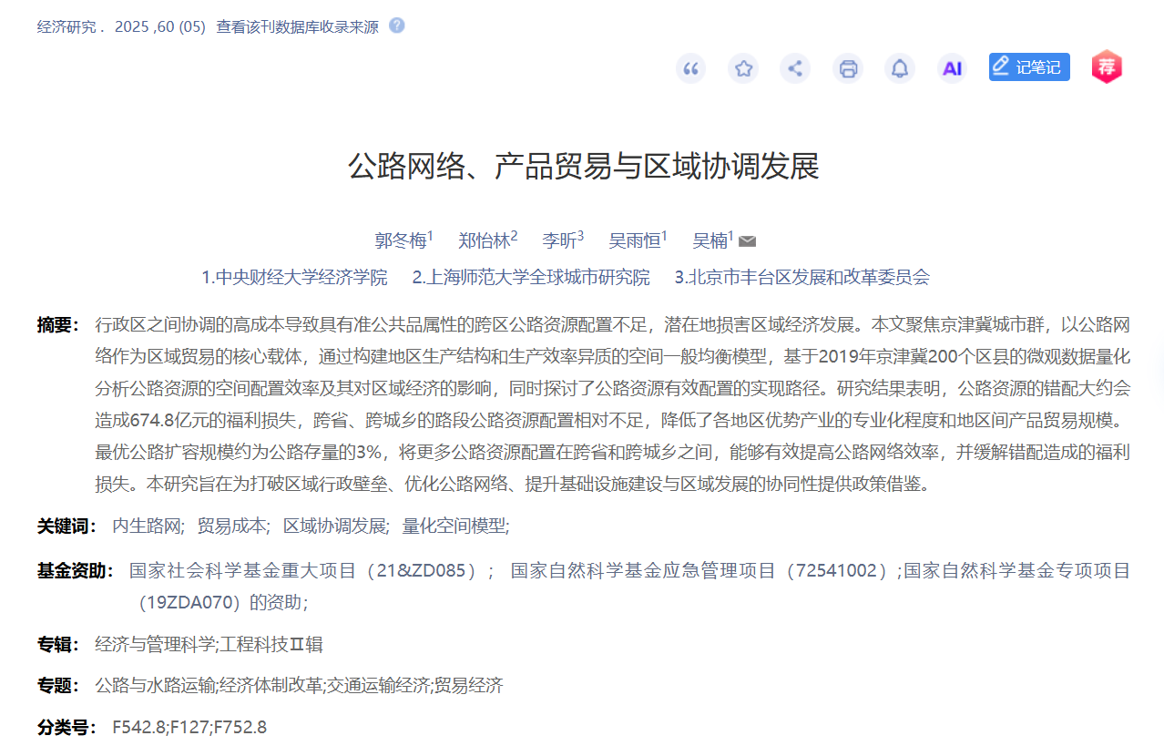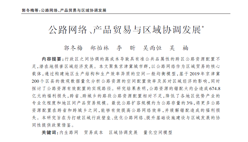 BEAT365官网郭冬梅老师、吴楠老师和吴雨恒博士生与合作者的论文《公路网络、产品贸易与区域协调发展》在《经济研究》刊发