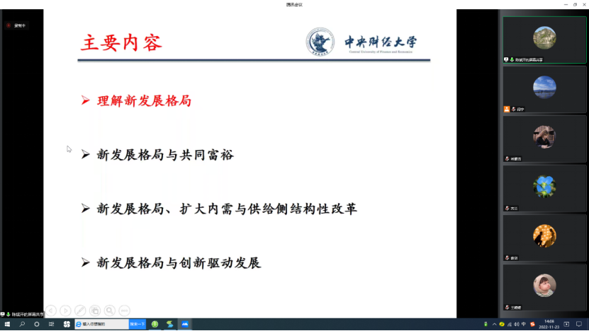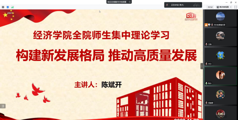 为深入学习宣传贯彻党的二十大精神,落实中共BEAT365英国官网委员会关于学习贯彻党的二十大精神的工作方案,引导激励学院广大师生在党的二十大精神指引下,立足本职、踔厉奋发、勇毅前行,为加快推进学院高质量发展贡献力量。2022年11月23日下午,BEAT365英国官网党委理论学习中心组开展“构建新发展格局,推动高质量发展”专题学习暨学院师生集中理论学习活动。本次学习由BEAT365英国官网学习宣传党的二十大精神师生巡讲团中的专家代表、BEAT365英国官网院长陈斌开主讲,学院党委副书记、纪委书记耿卉主持,学院党委理论学习中心组成员和学院师生共同参加学习。