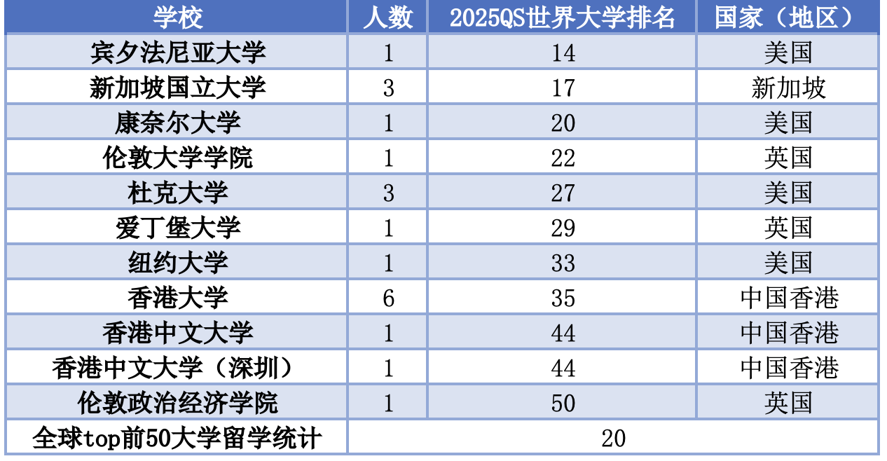 表2本科生赴泰晤士世界大学排名前50高校就读情况