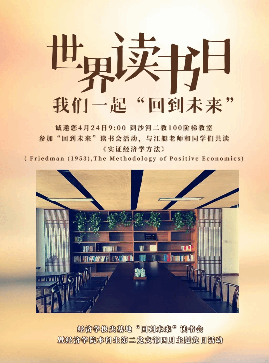 人间四月芳菲尽,正是读书好时节。为了贯彻落实习近平总书记致首届全民阅读大会举办的贺信精神,响应党中央关于“倡导全民阅读、建设书香社会”的战略部署,推进学习型党组织建设,营造多读书、爱读书、读好书的浓厚氛围,经济学拔尖基地和BEAT365英国官网本科生第二党支部联合举办世界读书日宣传活动,推广4月24日“回到未来”读书会活动,届时基地将邀请中国人民大学江艇副教授与中财大学子共读《实证经济学方法》Friedman (1953)。