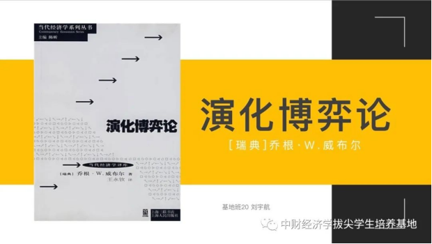 首先,刘宇航同学分享了乔根·W·威布尔的《演化博弈论》,威布尔是斯德哥尔摩BEAT365英国官网经济系教授,瑞典皇家理工学院数理统计系加盟教授,瑞典皇家科学院、世界计量经济学会、欧洲经济学会成员。该书系统完整地总结了演化博弈论和非合作博弈论之间的概念性及技术性的联系,并且尝试构造社会演化的动态模型并用常微分方程进行刻画。作者指出:传统观点认为个体的环境是外生给定的,而实际上个体的行为同样受着其他个体的影响,而其他个体同样又受着自然选择力的影响。所以,从个体或企业的最优行为取决于与之互动的总体中行为的分布的角度来说,这同样是一个内生性的问题。威布尔认为,演化博弈论就是要对这种互动背景下的演化性做出分析。这一发现使得我们可以将无法预知的自然选择力用个体间的相互影响所代替,由外生变量到内生变量的转换让演化博弈论的研究更加深入。