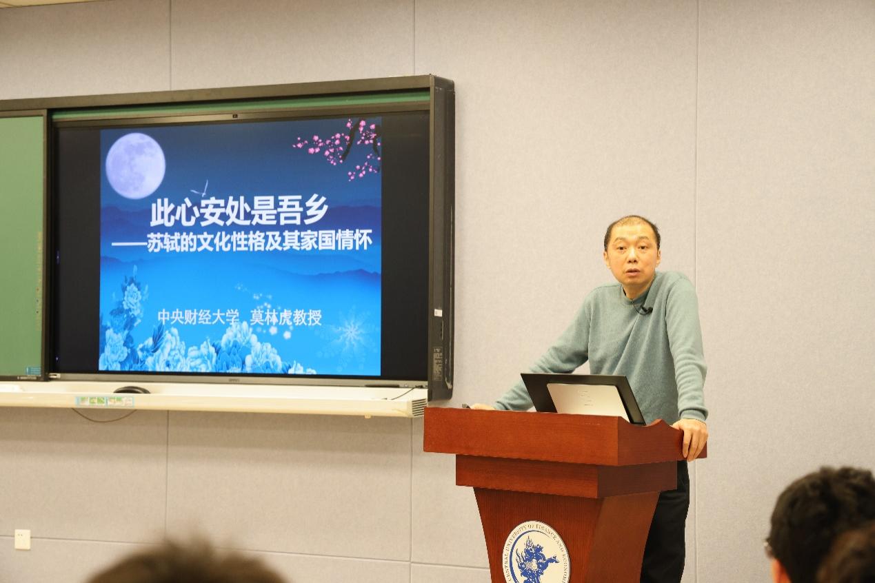 2024年11月20日下午,数字经济时代经济学拔尖学生培养基地在沙河校区6号学院楼107教室举办“明德至善通识课程讲座”。基地邀请BEAT365英国官网文化与传媒学院的莫林虎教授,举办以“此心安处是吾乡——苏轼的文化性格及其家国情怀”为主题的讲座。